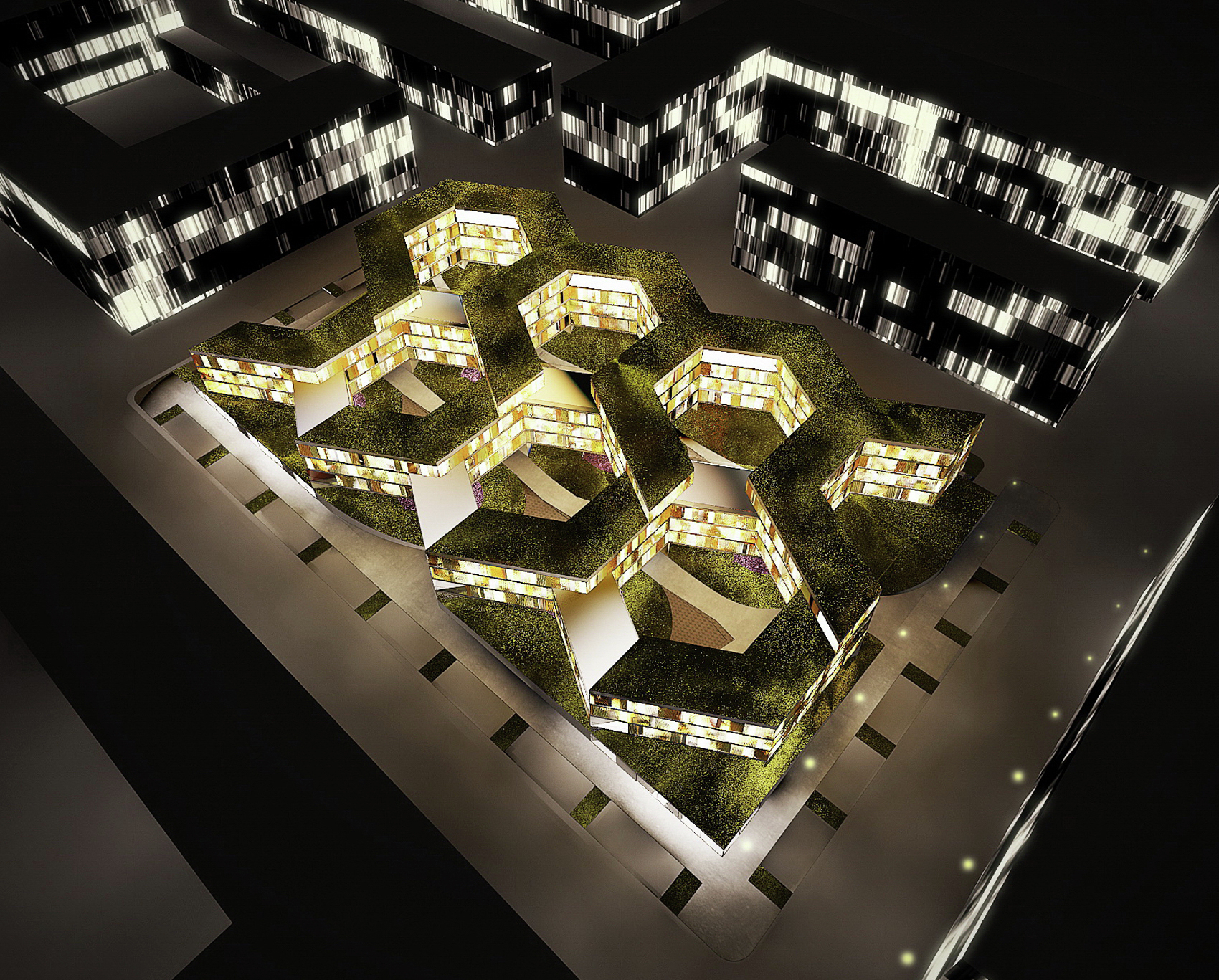 What is the largest human building scale? A kind of village-feeling: our children are playing in the park, hearing their voice we are looking out of the window and they are able to recognize our face. So we imagined a building with two, three or maximum four levels. Also this is the height where the trees usually grow up to and where the chirping birds still can be heard, so we live close to the nature.